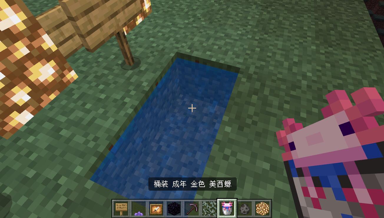 首先我們需要用工作台合成一個鐵桶,然後拿著鐵桶對著美西螈按滑鼠右鍵,就可以抓住美西螈了。
