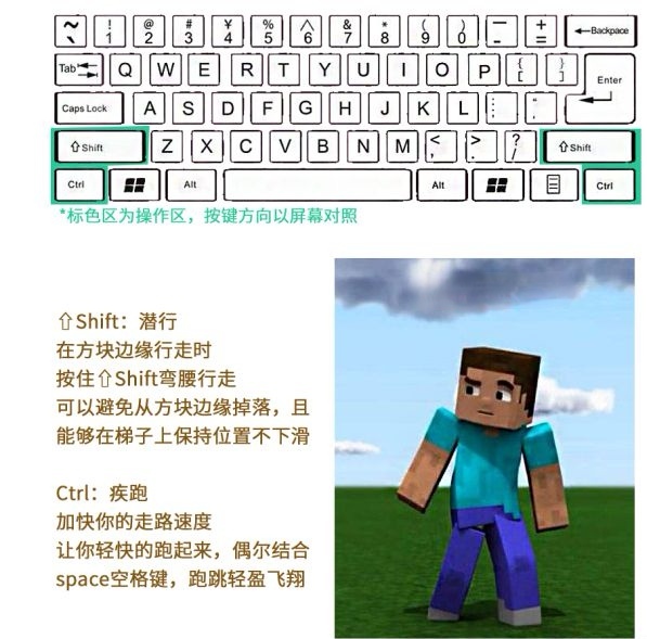 Shift潛行按住Shift可以避免從方塊邊緣掉落,且能夠在梯子上保持位置不下滑,ctrl 疾跑,連按兩次W也能達到相同的效果。