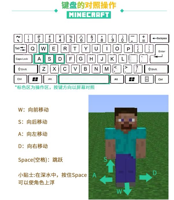 W向前移動、S向後移動、A向左移動、D向右移動、space跳躍,在深水中,按住space可以使角色上浮。