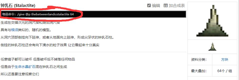 可以用指令/give @p thebetweenlands:stalactite 64獲得鐘乳石。