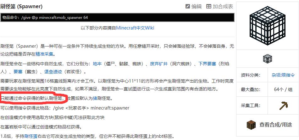 3,接著就會發現,在該說明中並沒有說明該物品可以合成,只說明了該物品只能通過指令獲得,所以刷怪籠是不能製作的。