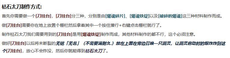 首頁 我的世界 問答 我的世界枯石太刀怎麼獲得? 2022-08-22 將未斷裂的無銘放在上面在旁邊召喚一隻凋靈,讓凋靈啟動時的爆炸炸到這個[刀掛台],然後你就能得到枯石太刀了。1,首先我們搜索並進入枯石太刀的相關說明。2,然後往下滑動就可以看見枯石太刀的獲得方法了。