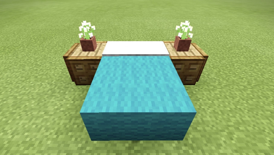 2、床。羊毛做床的主體,地毯做枕頭,比原版床更具層次感。利用木製陷阱門修飾木板,最後再放上溫馨的花盆,完美的床就做好了。