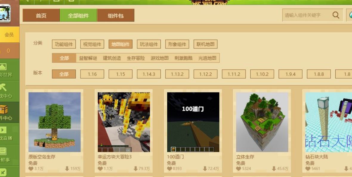 首頁 我的世界 問答 我的世界怎麼下地圖? 2022-08-23 接下來就介紹一下我的世界的相關攻略,想了解的小夥伴一起來看看吧。1、首先打開我的世界啟動器。2、點擊主界面上的組件中心。3、點擊上方的全部組件。4、點擊地圖組件,如圖所示。5、找到你想要下載的地圖,點進去,並點擊下載即可。