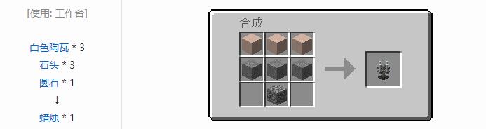 首頁 我的世界 問答 我的世界蠟燭怎麼做? 2022-08-23 我的世界原版是沒有蠟燭的,只有第三方MOD的蠟燭,製作方法為三個白色陶瓦,三個石頭和一個圓石製作。1,首先我們搜索並進入蠟燭的相關說明。2,然後就可以在界面下方發現蠟燭的製作方法了。