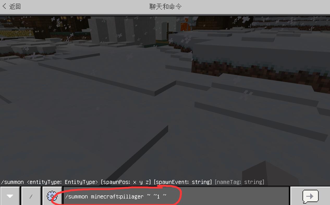 1,首先我們進入遊戲,在聊天框里輸入/summon minecraft:pillager ~ ~1 ~。
