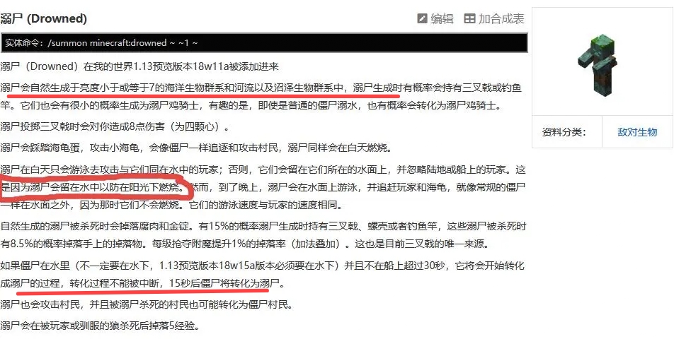 首頁 我的世界 問答 我的世界溺屍生成機制是怎樣的? 2022-08-24 溺屍會自然生成於亮度小於或等於7的海洋生物群系(任何變種)和河流以及沼澤生物群系中。如果殭屍在水裡(不一定要在水下)並且不在船上超過30秒,它將會開始轉化成溺屍的過程。