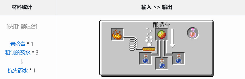 防火藥水可以用一個岩漿膏和三個粗製的藥水進行合成。用粘液球加烈焰粉就可以製作出烈焰膏了,釀造台可以用三個原木加一個烈焰棒進行製作,粗製藥水只要用水瓶就可以進行製作了。玩家在防火藥水之中加入紅石粉可以延長藥水時間,加入螢石粉可以加強藥水的效果。