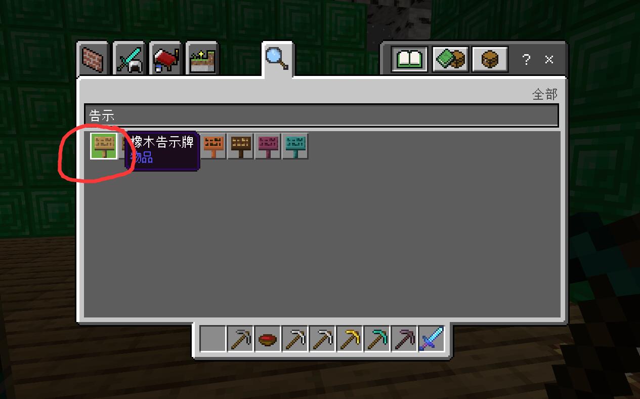 1,首先我們進入遊戲開啟創造模式,拿一組告示牌。