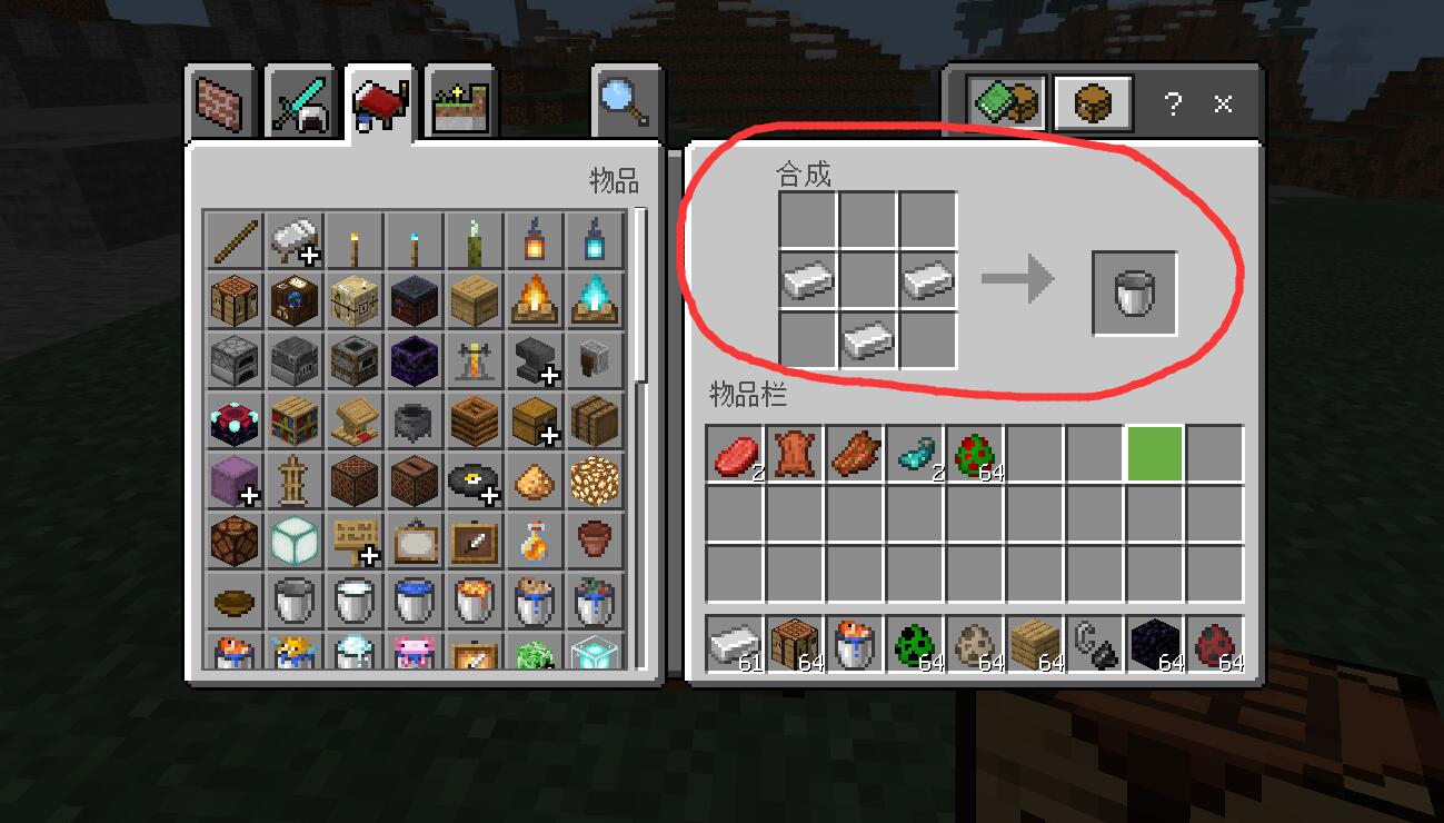 1,首先我們需要用工作台製作一個鐵桶,製作方法如下,為三個鐵錠放置在一起。