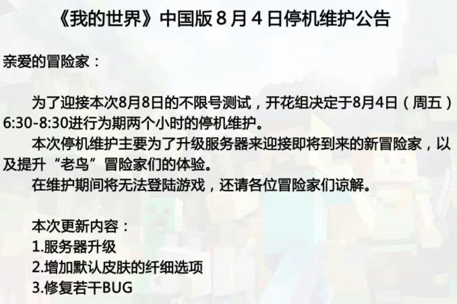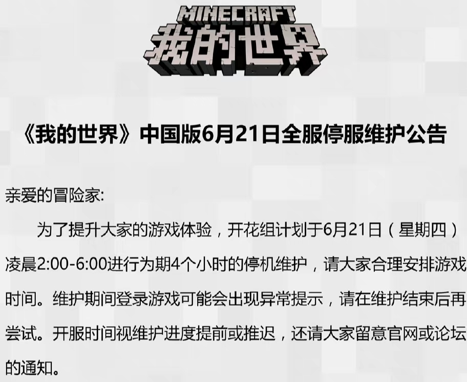 通過查詢我的世界官網可知,這款遊戲更新維護的次數比較少,但每次維護時間大概在四個小時左右,有時會稍微延長或者推遲一些,都是正常現象。
