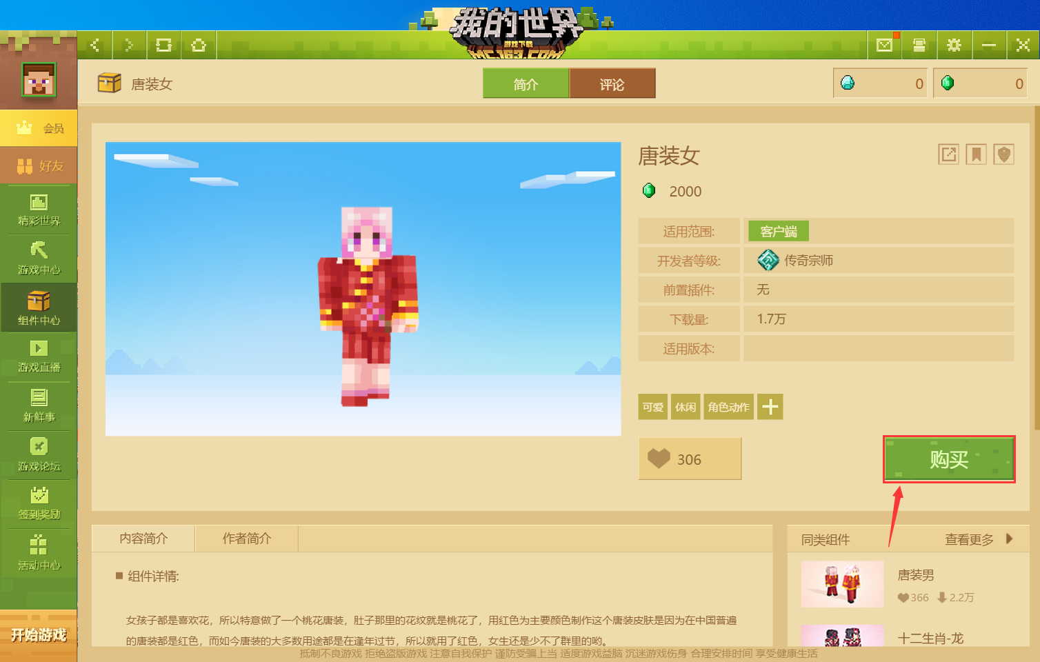 3.選擇一個皮膚。選擇好後在右下角點擊「購買」按鈕,購買完成之後,在左下角點擊「開始遊戲」按鈕。進入遊戲按「F5」可以看到皮膚已經修改。