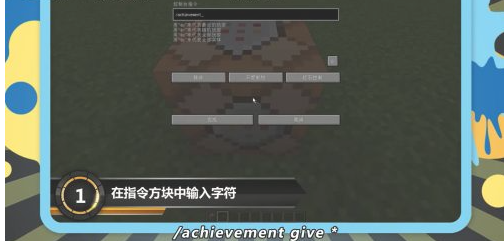 1.在指令方塊中輸入字元「/achievement give*」就能瞬間得到所有的成就包括熱門景點成就。