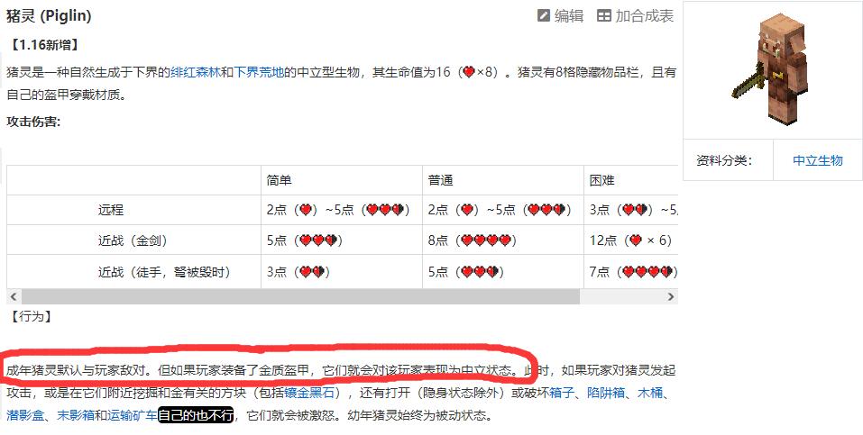 2,然後找到豬靈的相關說明,就會發現豬靈默認是對玩家敵對的,玩家裝備上金質盔甲豬靈才不會攻擊玩家。