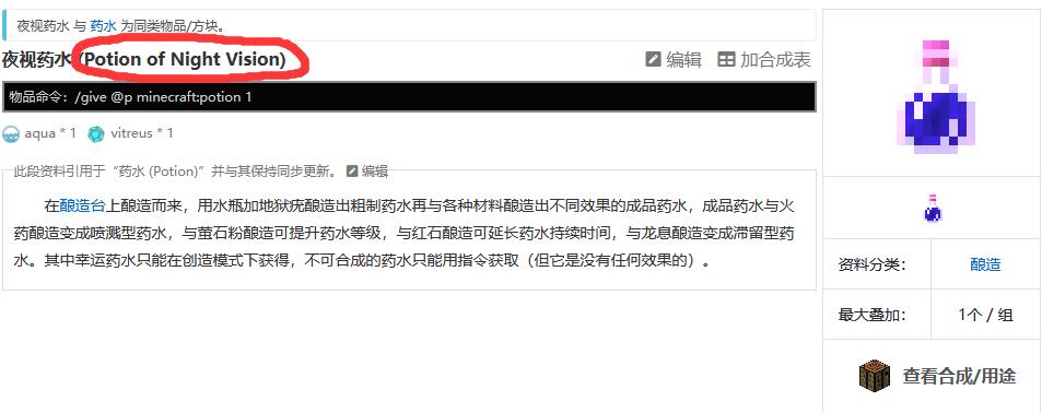 我們可以進入我的世界夜視藥水的相關說明,然後就可以在界面左上角發現夜視藥水英文是Potion of Night Vision。