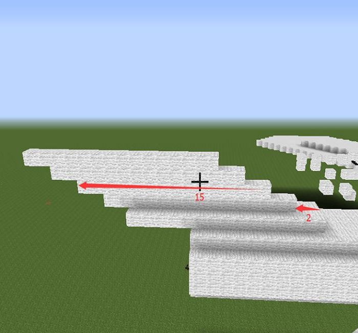 28.最後開始做機尾。首先在機身上放置寬3格長10格的羊毛。然後向外擴充5格。