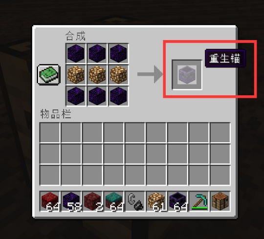 首頁 我的世界 問答 我的世界重生錨怎麼獲得? 2022-09-01 有些玩家不知道我的世界重生錨怎麼獲得,具體步驟如下:1.首先,我們可以在工作台的界面中使用六個哭泣的黑曜石以及三個螢石如下擺放,就可以合成一個重生錨