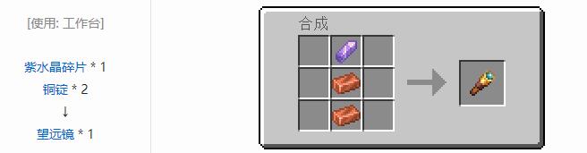 首頁 我的世界 問答 mc望遠鏡怎麼合成? 2022-09-02 用一個紫水晶碎片和兩塊銅錠就可以合成望遠鏡了。1,首先我們需要找到工作台,然後右鍵進入工作台里。2,接著按照如圖所示用一個紫水晶碎片和兩塊銅錠就可以合成望遠鏡了。