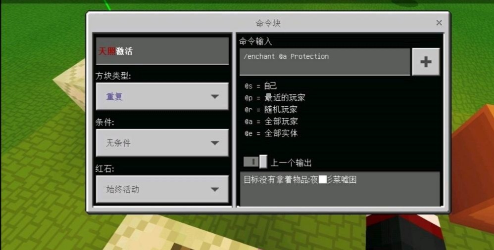 首頁 我的世界 問答 我的世界指令無效怎麼辦? 2022-09-03 在命令方塊輸入的指令其實都是服務端的命令,命令方塊提供了一種在遊戲中運行服務端命令的方法。首先也是最基本的,請在激活信號後無果的時候莫驚慌,仔細確認指令拼寫是否正確,還有方塊是否確實被紅石信號激活。