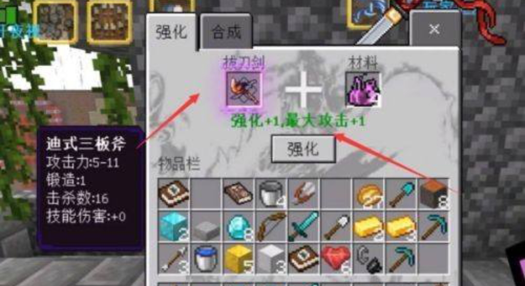 首頁 我的世界 問答 我的世界鍛造台怎麼升級工具? 2022-09-03 1、打開我的世界,選擇點擊「使用鍛造台」。2、選擇點擊「強化」選項。3、放入需要強化升級的工具和材料。4、點擊「強化」選項,即可完成強化升級。