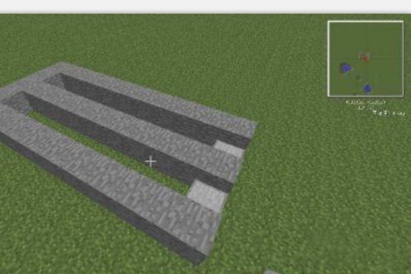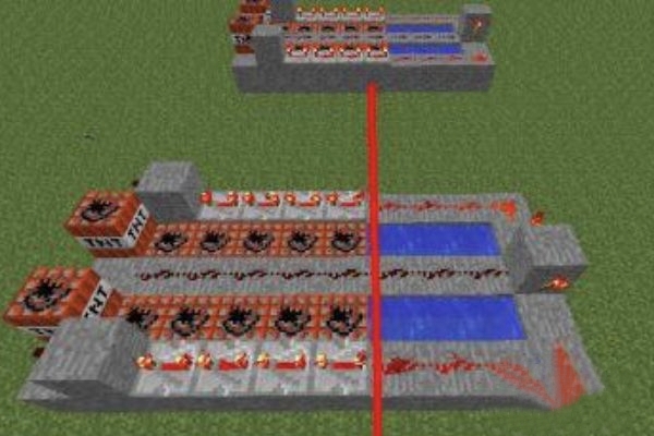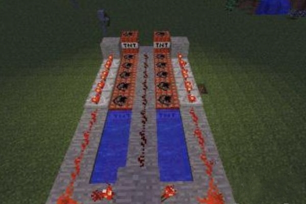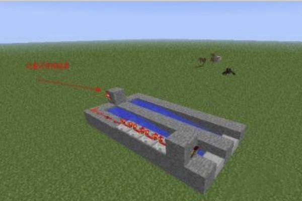 3、左邊一側放上一組紅石(紅石箭頭處),作為點燃按推動力。記得在左側牆壁前段放上一段不導電的物品。