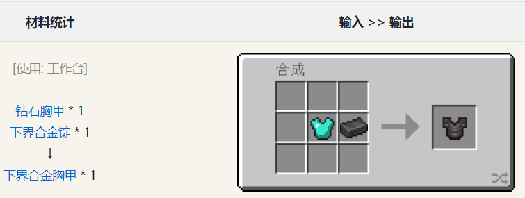 4、最後將鑽石胸甲和下界合金碎錠放在鍛造台中並取出,下界合金甲就做好了。
