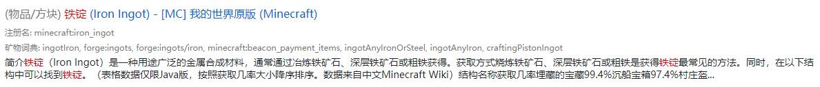 首頁 我的世界 問答 我的世界鐵的英文名稱是什麼? 2022-09-04 我的世界鐵的英文名稱是Iron Ingot。1,首先我們搜索並進入我的世界鐵的相關說明。2,然後就可以在界面左上角發現,鐵的英文名是Iron Ingot。