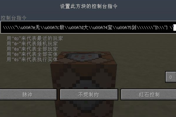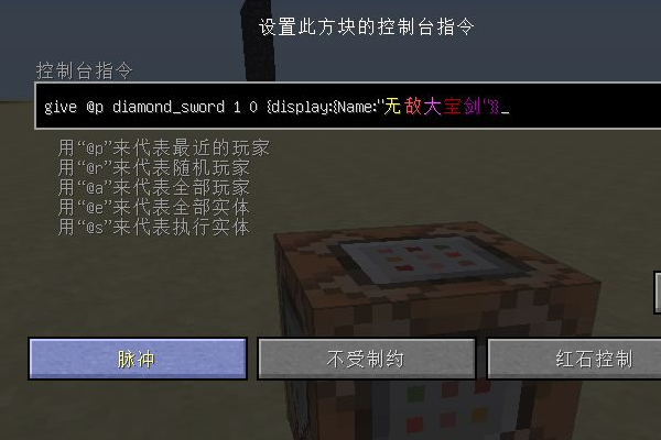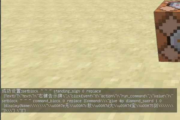 5、右鍵命令方塊打開命令方塊的編輯界面,輸入以下指令:setblock ~ ~ ~ standing_sign 0 replace {Text1:"{"text":"右鍵告示牌\",\"clickEvent":{"action":"run_command","value":"setblock ~ ~ ~ command_block 0 replace {Command:"give @p diamond_sword 1 0 {display:{Name:"u00A7e無\\u00A7c敵\\u00A7d大\\u00A74寶\\u00A75劍\\\\"}}"} "}}"}